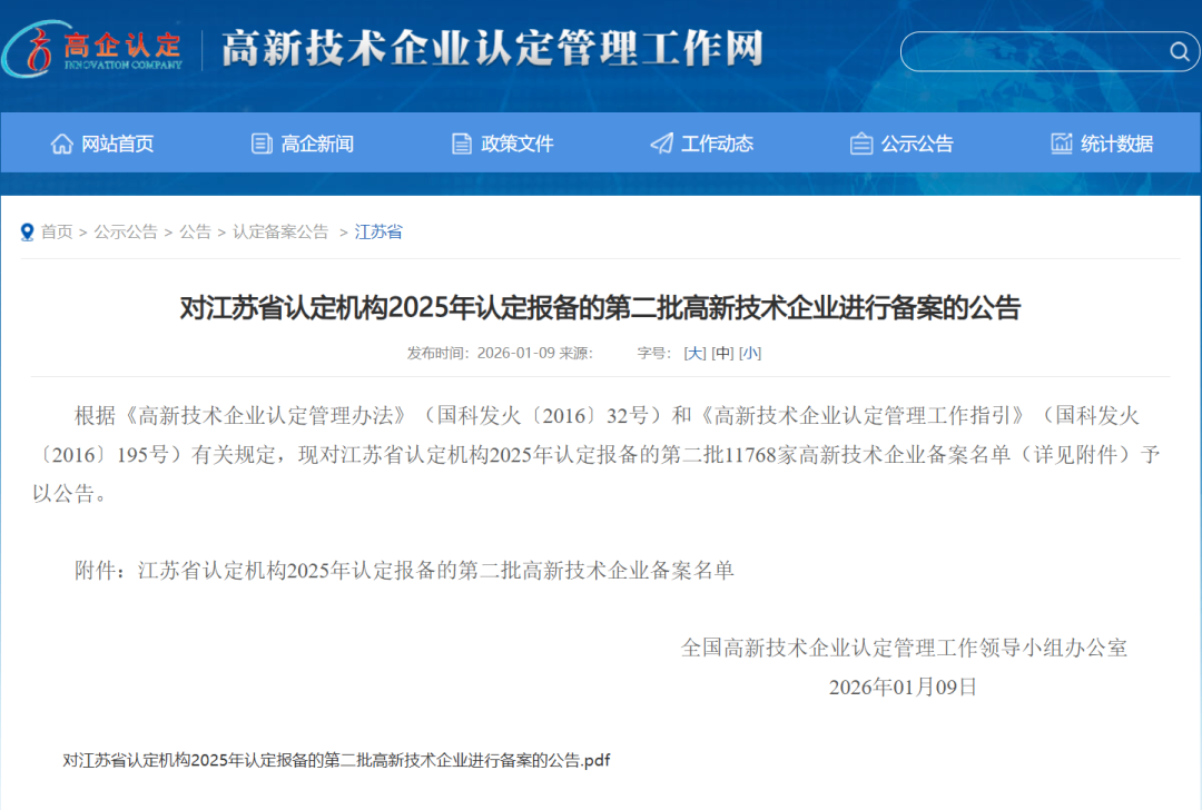 近日,根据《高新技术企业认定管理办法》及相关规定,全国高新技术企业认定管理工作领导小组办公室对江苏省认定机构2025年认定报备的第二批企业进行备案公示。jiuyou.com凭借其扎实的科技创新实力与完善的研发管理体系,成功荣列在本次备案中。